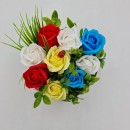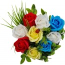 9 színes rózsából álló csokor, amelyet porzókkal és díszítéssel vesznek körül.